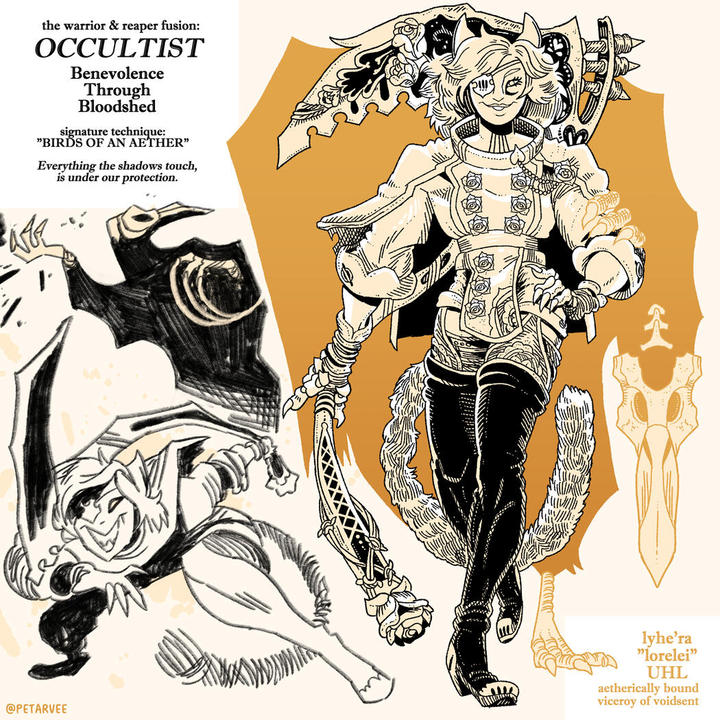 - out of all the children his mothers had together, lorelei is the youngest by several years. his older brother, lyhe'a, went missing some years ago. he has mixed feelings about the incident- lorelei is an avid enjoyer of haute coture, theater, and the arts as a whole. were it not for his fixation on weapon schematics, he likely would have pursued theater as a career choice!- lorelei field tests his own weapons! realistically though, this is his excuse to pick up bounty hunting as a way to pass the time. what's more fun than hunting down those who would cause others harm?- with his family hailing from a long line of yafaemi void scholars, lorelei is almost never without his amorphic, avian-adjacent voidsent companion, raum. more often than not, the voidsent takes the form of a small crow. easier on the eyes and more passable in public places!- more often than not, lorelei has good intentions at heart when it comes to protecting that which he cares for. however, he's notorious for taking things a little too far on occasion, sometimes making the situation worse than it was before- hates the color orange. specifically what he refers to as "traffic cone orange".
